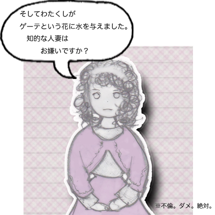 ウー:ここからの10年間は映画でいったらざっくりカットされるような場面ばかりよね。 サー:文学者だから書いてなんぼだから仕方ないんだけどさ、これってよく見るとゲーテは政治家をやりながら舞台を通して教育を行おうとしていたってことなんだ。 ウー:自分の地位と技術をそんなふうに活かすなんてクールよね! サー:そうなんだ。根っこは詩人だけど法律家でもあるから現実的でもある。だから政治も手堅くこなしながら柔軟なアイデアも実現させていく。 ウー:まぁ女としてはどうかと思うんだけど、それでもさらに人妻を相手に10年も関係を続けるなんてゲーテって。。。 サー:相当デキる男だったってことだ〜ね! ウー:だね。少しはタケルにも見習ってほしいわ〜ね!! 観客T:・・・・・・・・