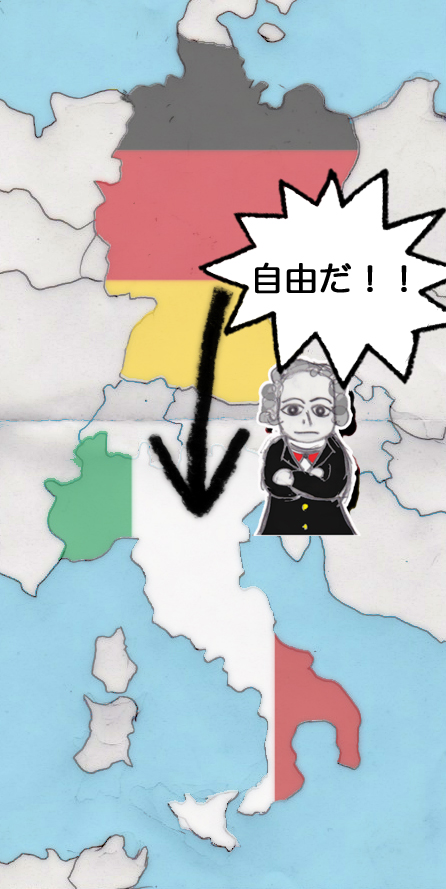 時は過ぎ1786年、ゲーテ37歳。 このときゲーテは念願だったイタリアへの旅を決行。このイタリア旅行はゲーテの生涯の中でも重要な出来事なのですが、これは幼い頃に父から受けた話からの影響、シュタイン夫人との関係から脱出、政治生活によって危機の瀕した詩人としての自身を取り戻すことが動機だったとも言われています。