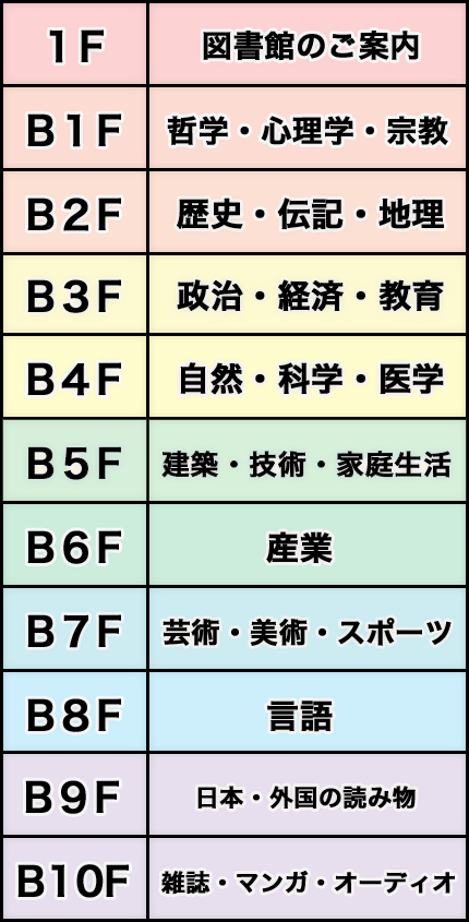 日本中の図書館の多くは、 本をこのように分類して並べております。 ですが、このようにザックリと分類をするだけでは本を探したり調べるためのきっかけにはなりません。 そこでワタクシがお客さまと一緒にエレベーターに乗り、これから地下1階から10階までございます図書館の各フロアをご案内したいと思います。 シンプルかつ、 丁寧にご案内するのがワタクシ、 ラブラブ司書ことラブリー・ライブラリーのモットーでございます。 お客さまの知識と好奇心を今より深め、自分を高め、世界を広げるためにどうぞお役立てください。 それでは、 下にまいります。