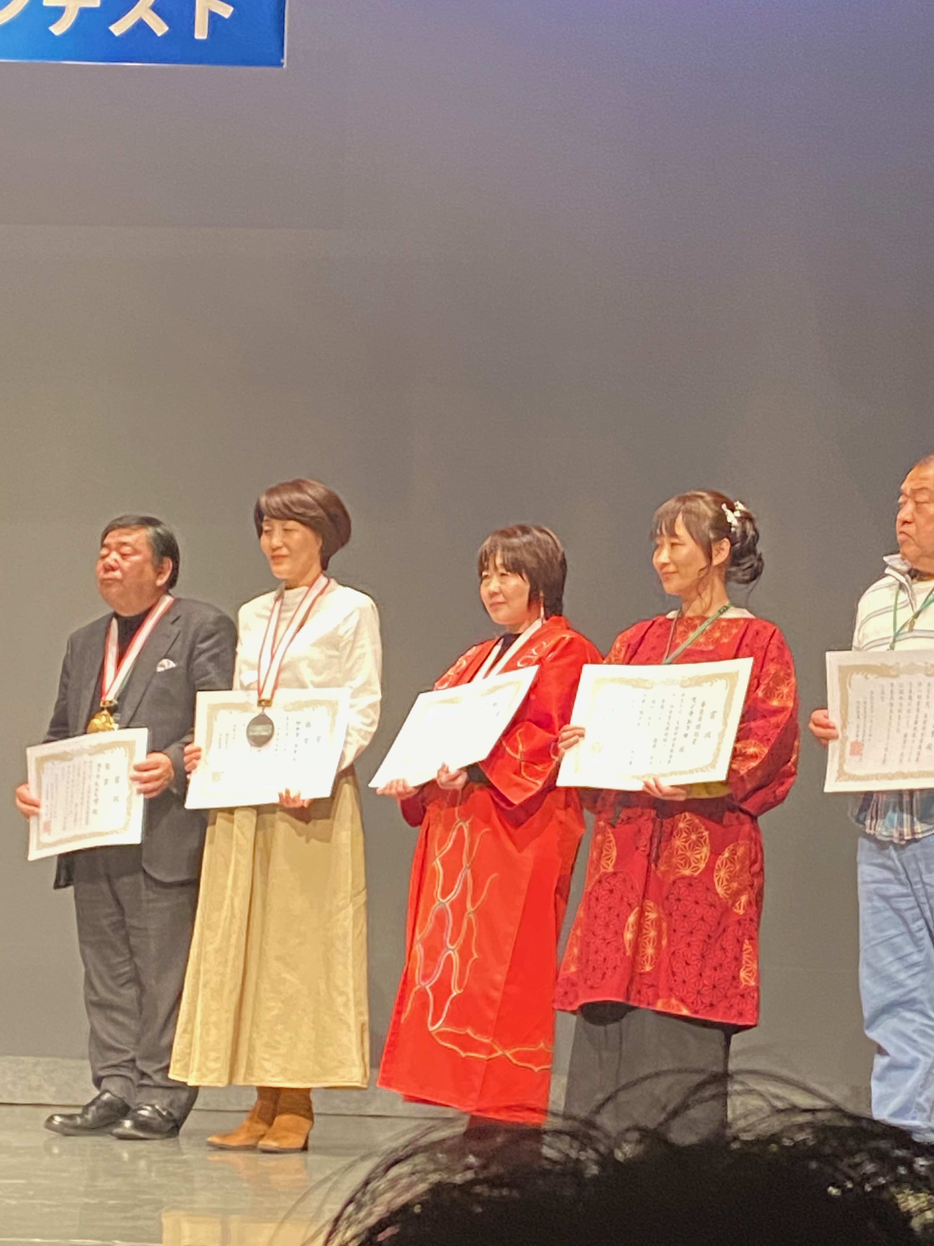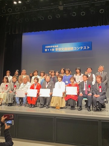 左が高校生の授賞式の様子。ここから未来の朗読家が生まれると思うとワクワクします。朗読文化の発展のために、続けて欲しい、若者たちよ! そして右が一般・認定講師の部の受賞者。一番左の方が金賞、右へ行き、銀賞、銅賞、特別賞2名と続きます。