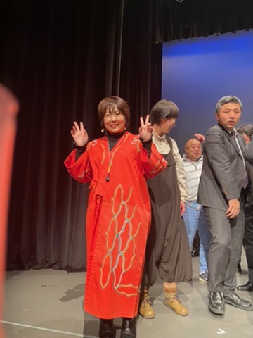 左は参加者の集合写真の絵。 右がアイヌの赤い衣装を着込む玲さんです。アイヌの衣装とか、漫画のゴールデンカムイでしか知らなかったのですが、和服と北欧の文化が合わさったような柄が非常に魅力的です。