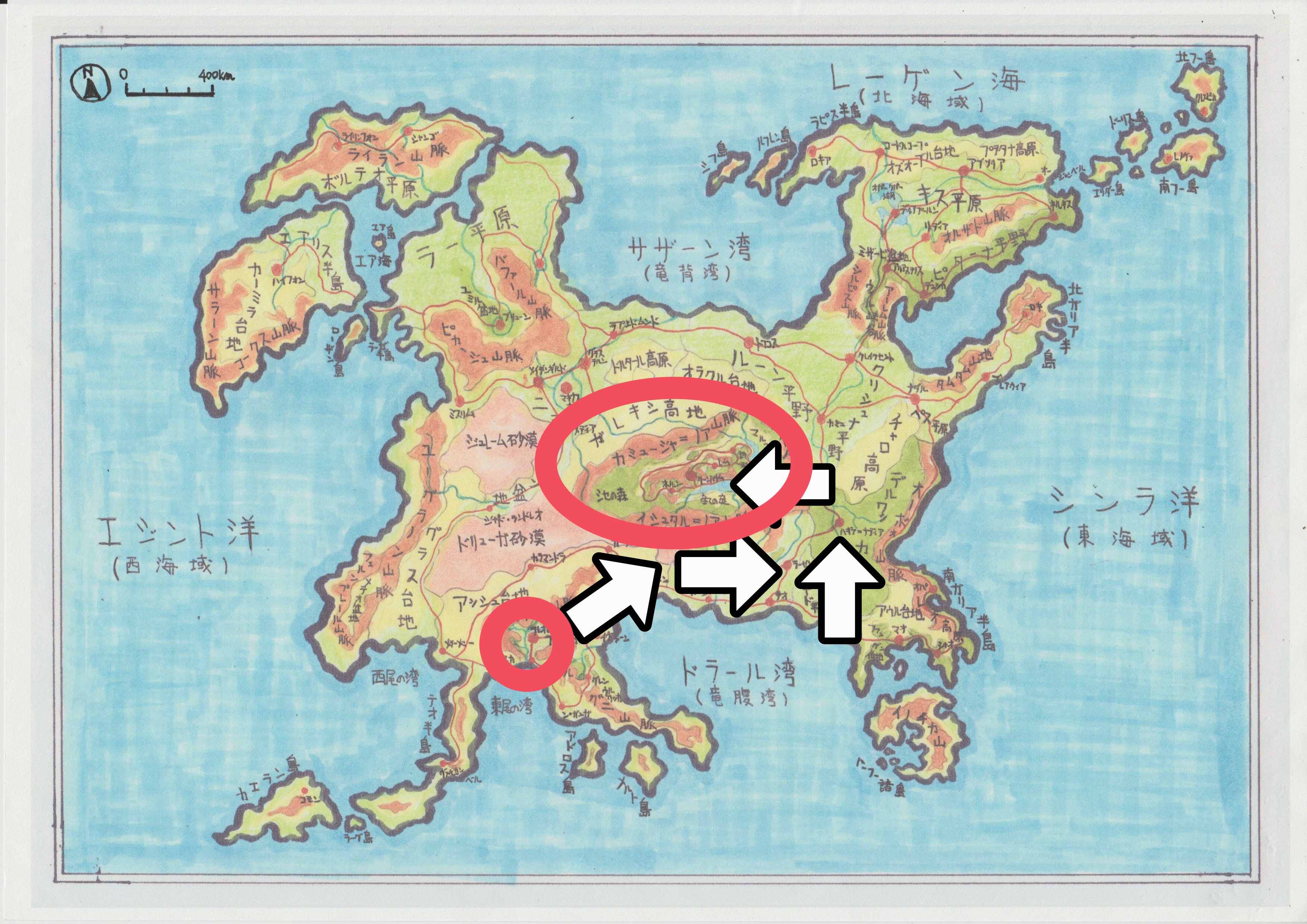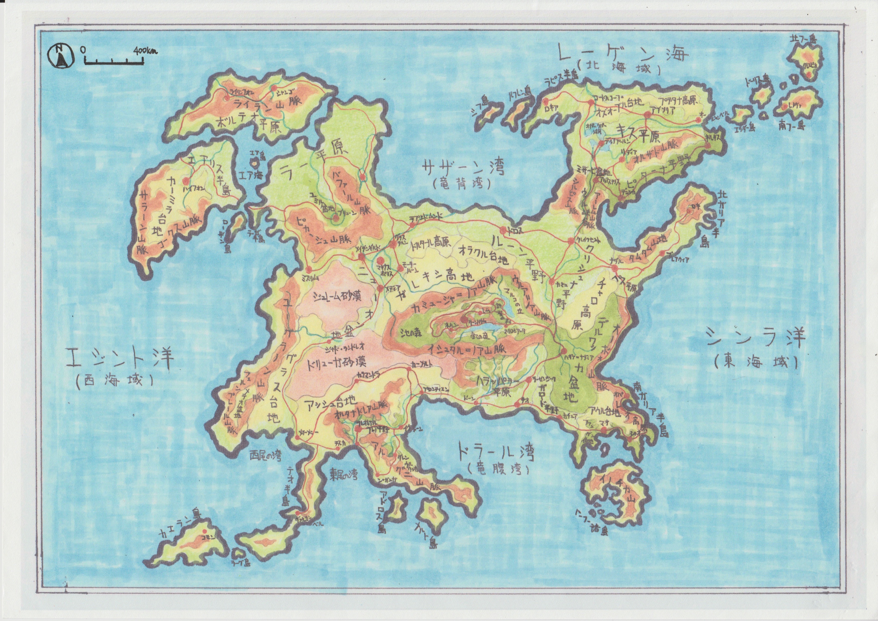 ウー:う〜む、しかし、実際問題文字が小さくて見えないわね。 サー:。。。でしょ? 地図の左上に「Nマーク」があるってことは、上が「北」。幅400キロメートルの長さの基準があるから、その広さは大体分かるけど。。。 ウー:これ見ただけじゃ、始鳥大陸エルフレアの全体像がぼんやり見えるだけよね。 サー:そもそもさ、世界をザックリ紹介するだけでいいなら、どの場所にどの国があるのかを分かりやすく伝えて、今回の舞台にフォーカスしていけばいいんじゃないかな? ウー:それいいわね。ロッキー、もっと手前の段階の地図に変身して、世界の事情を透け透けにしてちょうだい!
