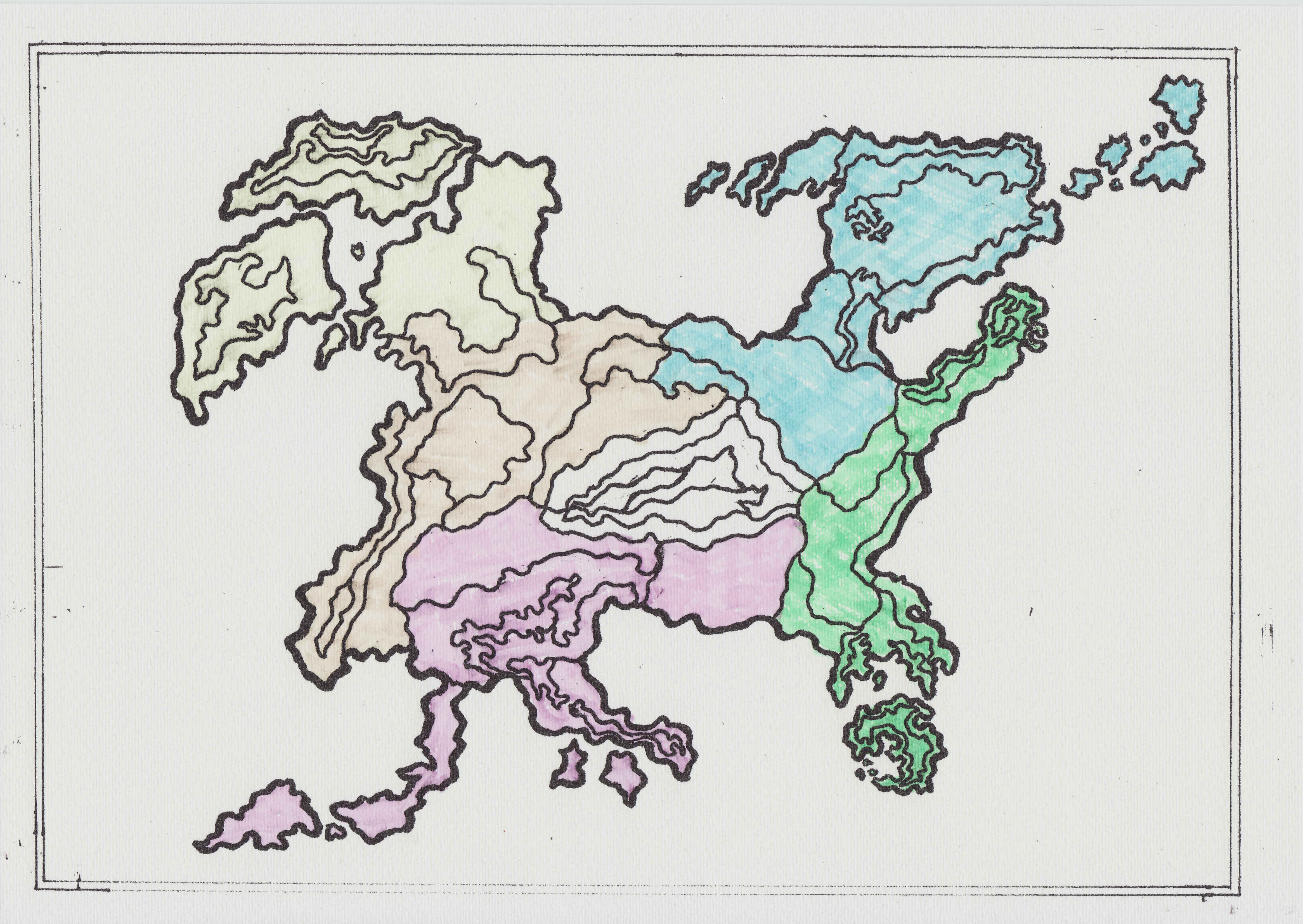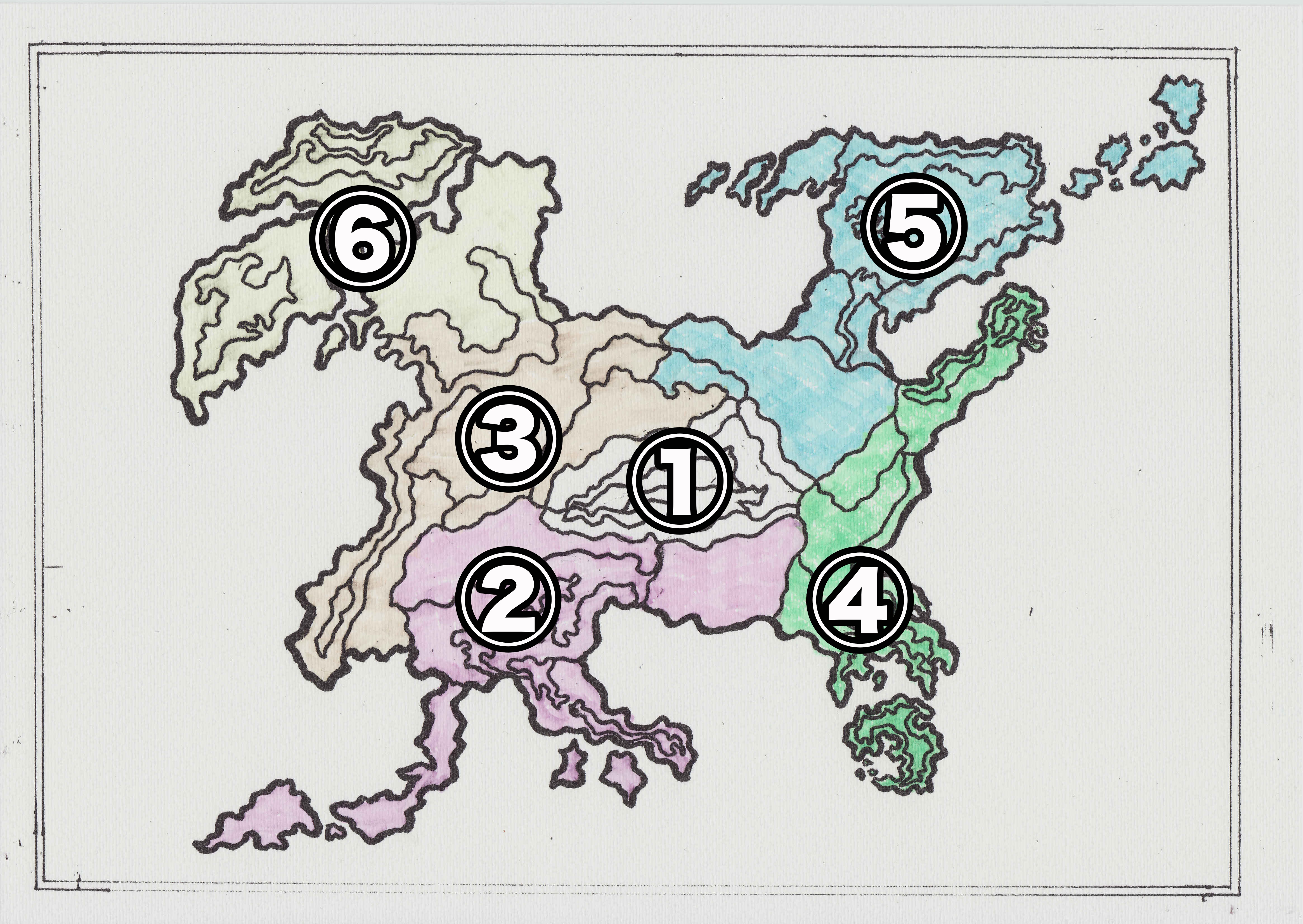 いい感じ! 白の国がサンテルクロス国。 赤の国がガンダルシア国。 橙の国がギルティギア国。 緑の国がシンラ国。 青の国がアーヴァルニア国。 黄の国がハイフォーエン国。 この合計6つの国家がひしめき合っている大陸なんだ。 ロッキー、国の位置に番号を振ってくれるともっと分かりやすく紹介できるからお願いできるかな?