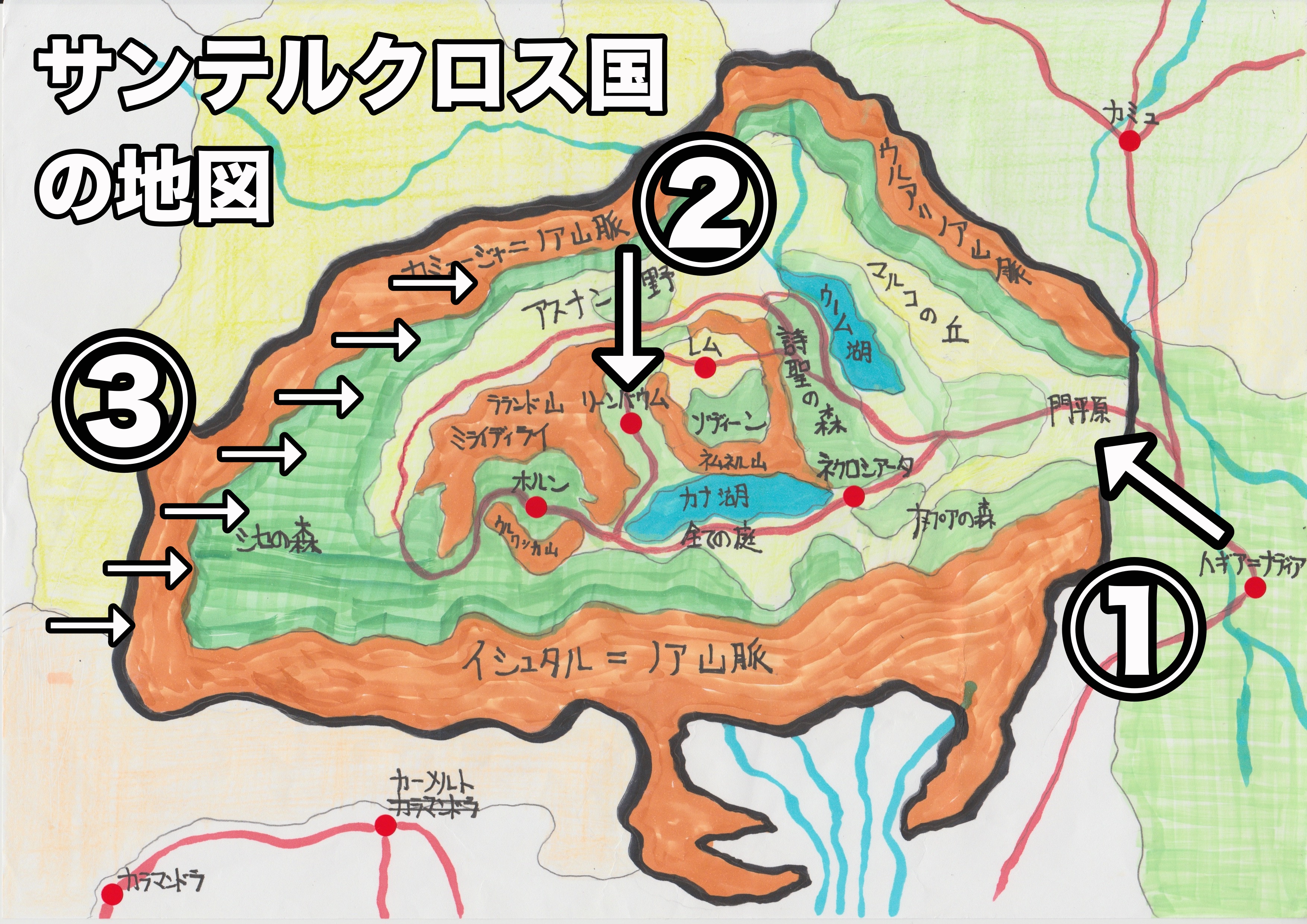 ウー:あら、分かりやすい。すでにナビまで付いているわ。 サー:なるほど、確かに山脈に囲まれた盆地のような土地なんだね。そして入り口がシンラ国からだけ。。。というわけだけどーー ウー:ーー①のマークはここから侵入されますよ。っていう印ね。門平原があって、マルコの丘とナプアの森が広がっていてーー サー:あの赤い丸は町や都市名ということになるのか。②番マークの矢印↓の先が王都リーンバウム。物語の主人公のシェルが育ち、守るべき場所だ! 同時にガンダルシア国が最も攻め入り、メチャクチャに荒らしたい場所でもある。 ウー:中心の東、右にあるのが闇の都レム。大陸最強詩魔法使いのユディル・エグゼウスの生まれ故郷ね。 サー:となると、リーンバウムの左、つまり西にあるのが光の都ホルンだね。大陸最高詩魔法使いのレイルン・サンの生まれ故郷だ。そして、大聖域たる所以の聖地、詩聖の森の下にあるのがネクロシアータで計4つの町や都市がサンテルクロスには存在するというわけだ。 ウー:ちなみに、あの③の矢印→はなに? サー:あぁ、あれね。あれは本編を読んだら分かるよ。ドッカンバッカン!の進行方向だ。 ウー:ふぅ〜ん、ところでさーー